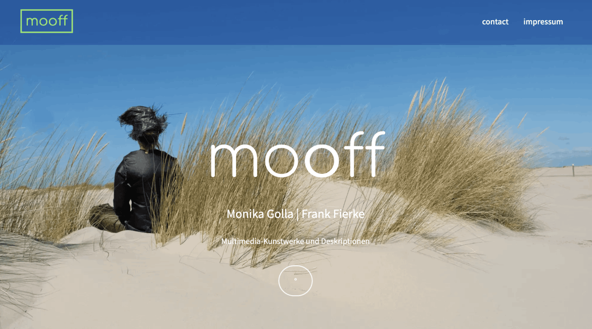 mooff sind Monika Golla und Frank Fierke. In der gemeinsamen Arbeit schaffen sie Multimedia-Kunstwerke. Objekte, die auf äußere Einflüsse reagieren und Videos, die nicht einer Chronologie oder klassischem Aufbau folgen. Ihre Arbeiten beziehen aktiv den Raum und das Publikum als Teile des Kunstwerks mit ein. Multisensorische und sinnliche Wahrnehmung sind wesentliche Bestandteile ihrer Konzepte. Barrierefreie Kunsterfahrungen und Deskriptionen in jeglicher Form.